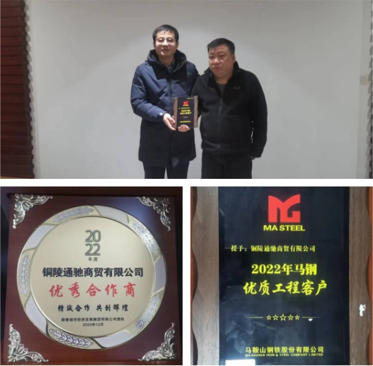 2023年2月10日,通馳商貿公司憑借精質的服務在眾多供應商中脫穎而出,榮獲馬鋼公司2022年度“優質工程客戶”稱號。馬鋼公司營銷中心市場分析師、首席營銷師夏仕卿特赴公司現場授牌并調研相關工作。