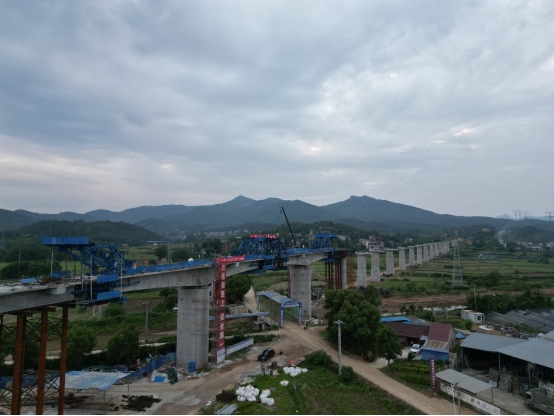 橫埠特大橋連續(xù)梁全長(zhǎng)137.2米,一聯(lián)三孔(40+56+40)米,采用懸臂澆筑法施工。橫埠特大橋連續(xù)梁的順利合龍,是繼仙人山隧道、黑山隧道、七家山隧道貫通、首座站房封頂、首榀T梁成功澆筑后,又一重大關(guān)鍵性節(jié)點(diǎn)。