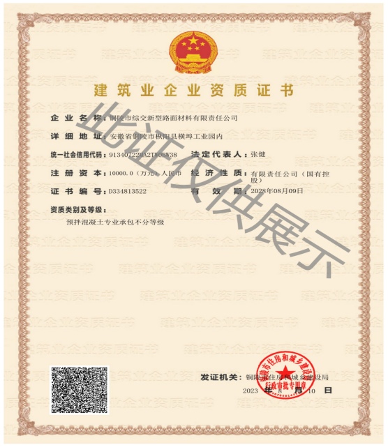 2023年8月,綜交新材料公司順利獲得建筑業(yè)企業(yè)預(yù)拌混凝土資質(zhì)證書,該項(xiàng)資質(zhì)的取得,標(biāo)志著綜交新材料公司在行業(yè)內(nèi)的重大突破,進(jìn)一步提升了在建筑行業(yè)內(nèi)的業(yè)務(wù)拓展能力和市場(chǎng)競(jìng)爭(zhēng)力,更好地服務(wù)于G3銅陵長(zhǎng)江公鐵大橋、G330一級(jí)公路改擴(kuò)建工程、江北港鐵路專用線及江北新區(qū)發(fā)展等重點(diǎn)項(xiàng)目的建設(shè),同時(shí)為綜交新材料公司在樅陽(yáng)縣域混凝土市場(chǎng)上站穩(wěn)腳跟奠定堅(jiān)實(shí)基礎(chǔ)。