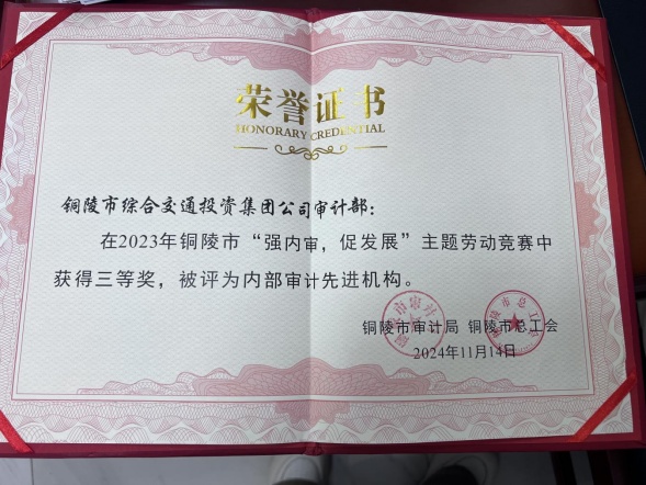 11月20日,市審計局舉辦全市內部審計學習交流培訓會,表彰2023年全市“強內審,促發展”主題勞動競賽先進單位,市交投集團審計部榮獲三等獎,被評為“內部審計先進機構”。