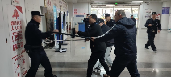 演練前,銅陵站派出所民警結合車站人流密集的特點,詳細講解了盾牌、鋼叉等各類防暴器材的使用原理、操作技巧及防護要點,并組織參演人員實操。隨后模擬了暴恐事件?,設定“暴恐分子”持械闖入車站、威脅旅客;在安檢口拒檢后持刀行兇等場景。工作人員發現異常后立即報警并啟動應急預案,使用防暴器械與“暴恐分子”對峙,同時組織旅客疏散。公安、特警等部門迅速到場協同處置,控制“暴徒”并恢復現場秩序。