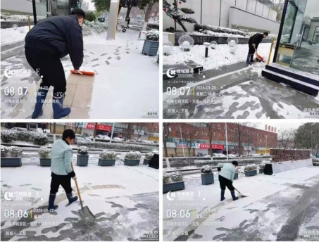 凜冽寒風中,室外溫度跌破冰點,路面積雪清理難度大。但這絲毫沒有阻擋大家的熱情——項目人員與物業服務團隊迅速集結,手持掃帚、鐵鍬等工具,分工明確、默契協作。有的彎腰揮鍬,奮力鏟除路面厚冰;有的手持掃帚,細致清掃殘余積雪。忙碌的身影在皚皚白雪中穿梭,勞動的汗水浸濕衣衫,卻讓這個寒冷的冬日格外溫暖。