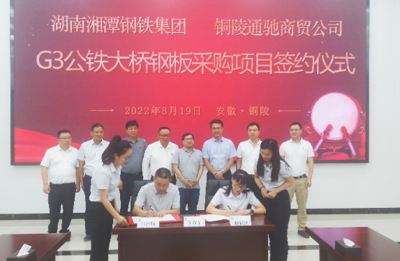 8月19日上午,集團公司黨委副書記、總經理周文勝在G3銅陵長江公鐵大橋項目部會見湘鋼集團黨委書記、執行董事、總經理楊建華一行。雙方就鋼板材料、物流服務等方面開展深入交流,并共同見證湘鋼集團與市交投集團司屬通馳商貿公司簽訂G3銅陵長江公鐵大橋鋼板采購項目合作協議。中鐵大橋局G3銅陵長江公鐵大橋項目部經理劉幸福及集團公司黨委委員、副總經理范美霞、湯世才,總工程師張葉來出席簽約活動。