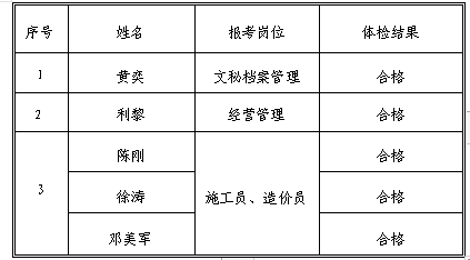 根據《銅陵市綜合投資集團有限公司(華越建設工程公司)公告》,交投華越公司綜合部于2020年4月27日組織相關崗位入圍報考者參加體檢,現將相關體檢結果向社會進行公示: