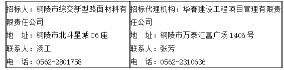 6、本次招標公告同時在銅陵市綜合交通投資集團有限公司(http://m.ydnjj.cn/)、安徽省招標投標信息網(http://www.ahtba.org.cn/)發布。
