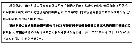 5.招標需求:銅陵市綜合交通投資集團有限公司通過公開招標形式選擇2022年銀行間市場債務融資工具主承銷商。本次發行的中期票據規模約為10億元,期限為3年,承銷商的主要服務內容包括本次中期票據的發行方案編制、注冊、報批、后續的發行承銷、備案工作及本息的代理兌付等工作。