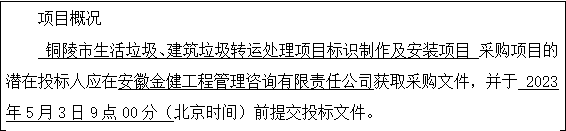 采購需求:銅陵市生活垃圾、建筑垃圾轉運處理項目標識制作及安裝項目,詳見招標文件項目需求內容。