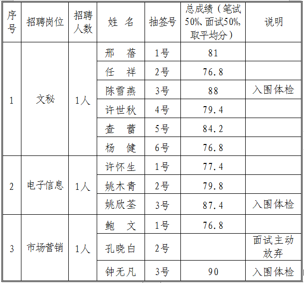 現將交投集團公司文秘、電子信息、市場營銷崗位招聘體檢入圍人員名單公示如下: