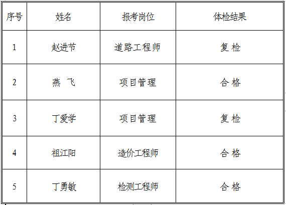 根據《銅陵市交通投資有限責任公司招聘人員公告》,集團公司綜合部于2018年12月17日組織報考道路工程師、項目管理、造價工程師職位的考生參加體檢,現將相關體檢結果向社會進行公示: