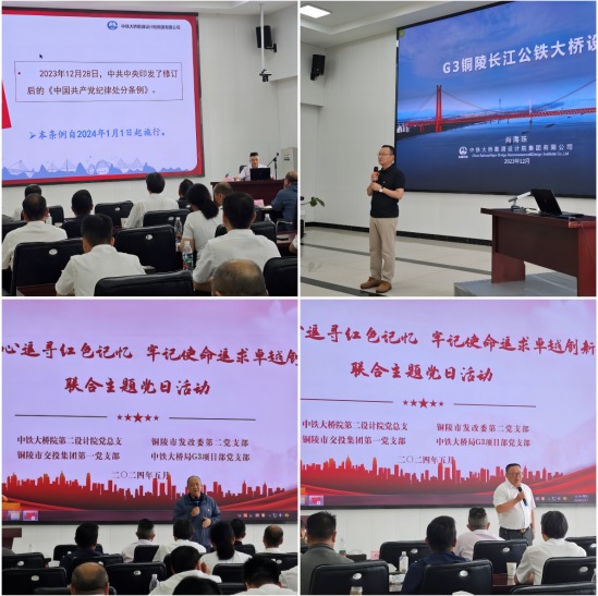 現(xiàn)場參觀過后,在G3大橋項(xiàng)目部會議室,中鐵大橋院黨建工作部部長劉建軍、中鐵大橋院總工程師、G3銅陵長江公鐵大橋總設(shè)計(jì)師肖海珠分別以《中國共產(chǎn)黨紀(jì)律處分條例》解讀、斜拉懸索協(xié)作體系橋設(shè)計(jì)為題作了輔導(dǎo)講座,并與聯(lián)合單位進(jìn)行了交流探討。集團(tuán)公司黨委副書記方勁松、中鐵大橋局G3項(xiàng)目部經(jīng)理劉幸福參與交流。