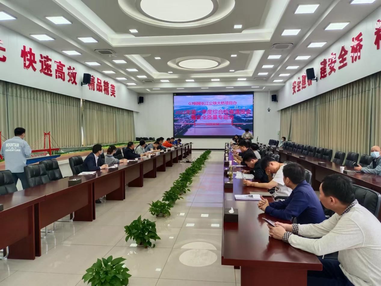 4月26日上午,G3銅陵長江公鐵大橋第一季度綜合檢查通報暨第一季度質量、安全會議在G3長江公鐵大橋項目部會議室召開。集團公司黨委委員、副總經理湯世才參加會議。集團公司工程部、G3長江公鐵大橋項目辦、各參建單位相關人員出席會議。